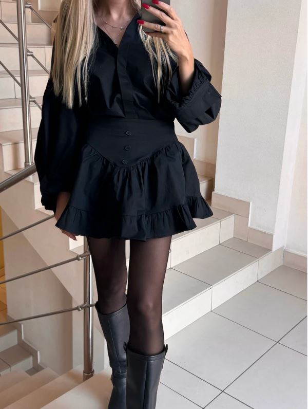 Рукава-фонарики и рюши придают женственность, романтичность и легкость, а короткая юбочка подчеркивает стройность ног.